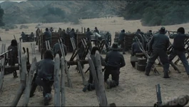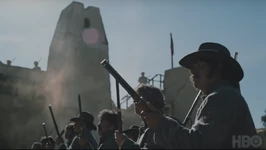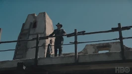 Долорес, Тедди и группа конфедерадос под предводительством майора Крэддока подъезжают к форту, разглядывая его издалека.