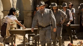 Taking a swig of Tequila as they seal up Slim's coffin, he tells them to be careful as they move to load his coffin up on a cart with others, telling them "Slim always had a bad temper." Turning, Dolores runs back into the brothel to get William whose been drinking. She tells him how El Lazo had been conning them the whole time, that he was never going to give the nitro to the Confederados, and they have to run.
