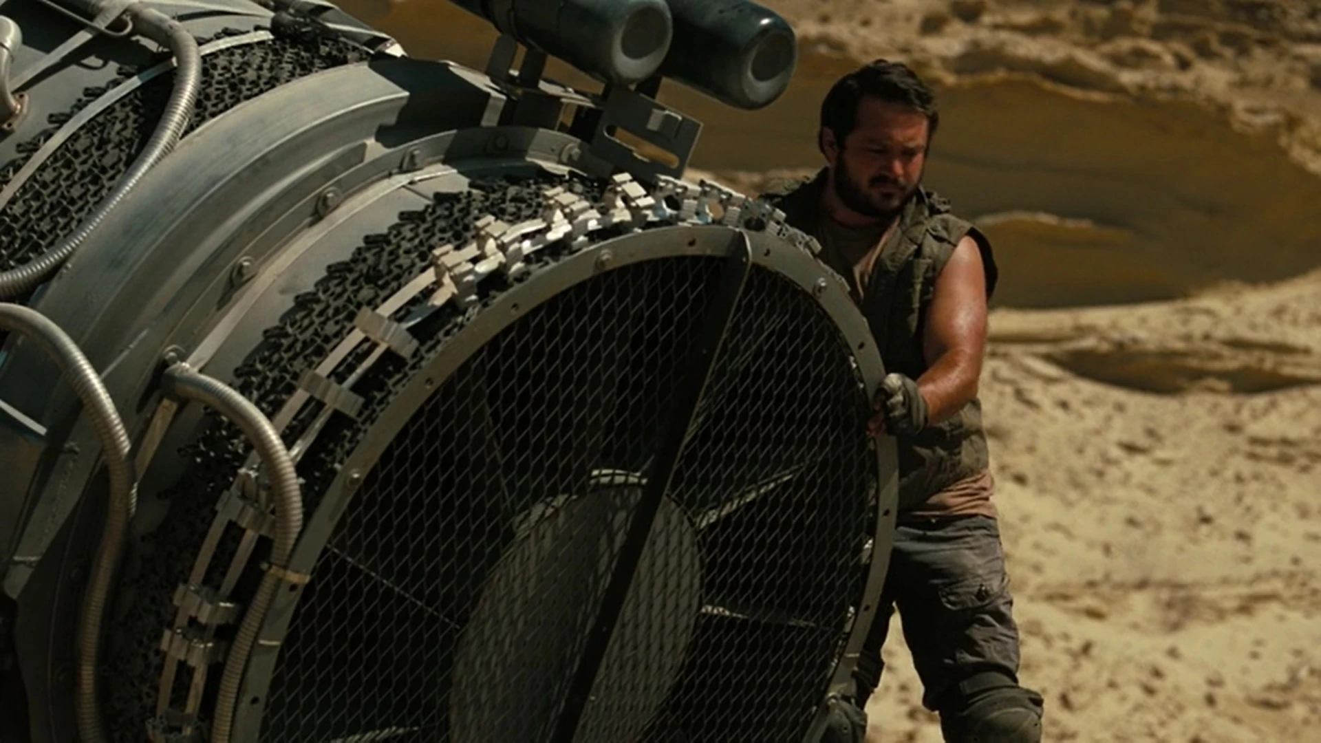 In the Outliers camp under guard, Bernard watches drones flying over the desert in the distance before he and Stubbs watch as a truck draws up with a huge fan on it's flat bed, Stubbs wondering what it's for. Bernard telling them they'll need some help to find what they're looking for under the sand. 'C' meanwhile confronts Jay reminding him that he his approval for the search. That, he says, was before they got word of another Outlier, her extraction takes priority before she gets hunted down. They can't waste time on what he feels to be a misguided treasure hunt. And what about Bernard and Stubbs she asks. Stubbs looking over at the discussion wonders what they're talking about, Bernard brutally frank saying "Deciding our fate," C wants to know what if they really are on the Outliers side, but Jay tells her they don't take chances on strangers. C argues that if there really is a weapon here the two could be their best chance to free everyone. Jay feels this is too personal for her, that she's lost all objectivity and they're not going to waste time on a myth. As Jay gives orders for everyone to get ready for the extraction, C says nothing, until he adds that it' best to 'travel light' and draws his gun heading for Bernard and Stubbs intent on killing them. C gets in his way and drawing her own weapon points her gun at him. The pair in a standoff. Stubbs looking for reassurance from Bernard gets told they live, mostly.