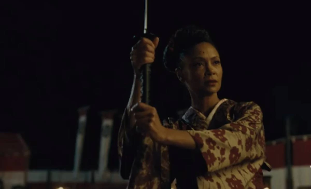 Maeve wielding a katana while wearing a traditional kimono