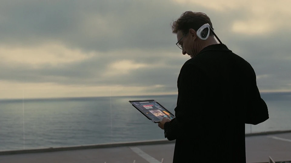 We see a large, modern cliff-top home from the sea. Inside the house an elegantly dressed Asian woman, Eunice, takes something from an Asian servant and heads out onto the balcony. A German man, Gerald is reading a tablet and is in conversation with his employee, Elliot. Gerald is angry, and discussing the situation (and deaths) at the Delos parks. When he tells Elliot to sell his shares in Delos, Elliot replies that regulations make this impossible and explains that Gerald will have to wait his turn. The woman tells Gerald that dinner is ready, he shouts at her and then at Elliot - telling him to make it happen.