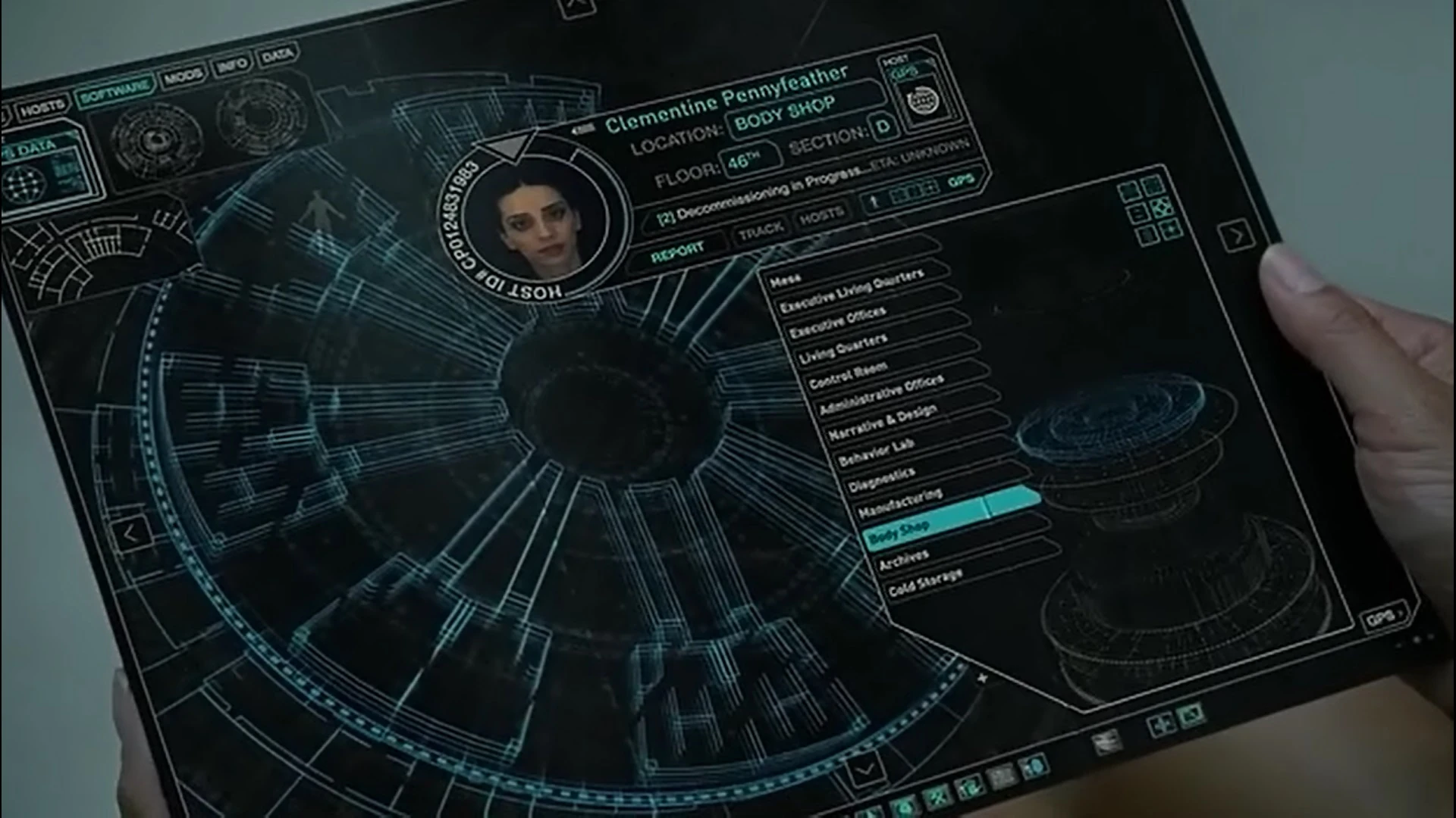 Back on the table for repairs, having engineered another death, Maeve is being attended to by Felix but with a female Tech. While the woman looks away Maeve, grabs Felix’s arm, startling him. But thinking quickly he tells the tech they're almost done and he'll close up for them. When she leaves he whispers urgently to Maeve that she's been up in the Park for less than 24 hours, if she keeps getting herself killed people are going to start noticing. "Where's Clem?" she asks urgently, but he doesn't know, he's not seen her, and asks why? She demands he find her, now. Grabbing his tablet he searches for her, but reacts on seeing the results, Maeve picking up on it, wanting to know where she is. He tries to pretend nothings come up, but she grabs the tablet and sees that she's in The Body Shop, her status as set for Decommissioning. She wants to go but Felix tells her they can't, that Management will be there. But Maeve tells him not to f*** with her, and to take her there now.