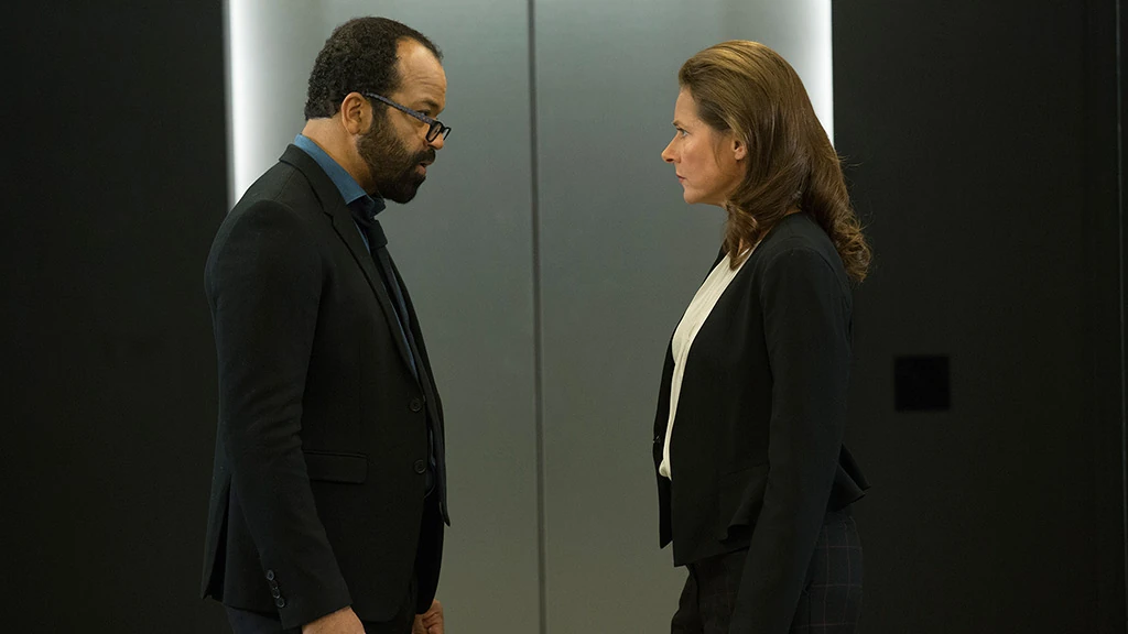 In walking with Bernard, Theresa tries to say that his show of professional collegiality in how he addressed her wasn't necessary in light of his 'change of employment status'. But Bernard cuts to the chase saying he knows the test with Clementine was a sham. Completely transparent from a technical perspective to the point of being embarrassing. If he see saw through it he can only imagine what Ford was thinking. There were glaringly obvious markers of human intervention in Clem's code, pointing out that if QA's coder were any good they would be working for *him*. And, he reveals that he knows she was behind the stray, and the satellite transmissions. That catches her by surprise. But he cuts off any attempt to explain with "I don't care." Going on to focus on his primary concern. "40 years ago Ford's partner wrote half the code this place was founded on." Essentially what she said in lab was right. They don't know how the hosts work, and he thinks there is something wrong with them. Ford's 'explanation' only bolstering his hunch. The ability to deviate from programmed behaviour arises from their ability to recall events from past iterations. That there is a connection between Memory and Improvisation, she checks, Bernard nodding. Out of repetition comes variation, he says, and after all this time the hosts are on the verge of 'some kind of change'. Taking that in, Theresa nods, and taking his arm tells him that he needs to know that her chief concern has always been the welfare of the Park, and the people in it. "I know," he says, which is why he needs to show her something, heading with her into the nearby elevator.