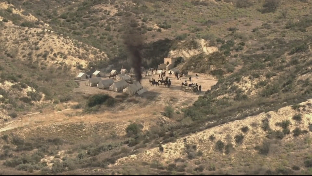 Most of the camp consists of simple army canvass tents of varying sizes, and parked covered wagons and flatbed wagons. There are several camp fires strewn around the camp, for the needs of the soldiers. One of the flatbed wagons in the camp is equipped with a Gatling gun.